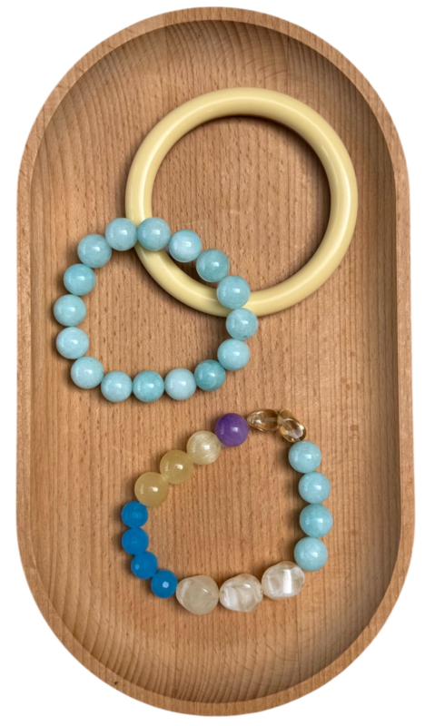 Natural materials such as: Jade, Citrine, Lemon Quartz.